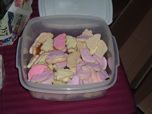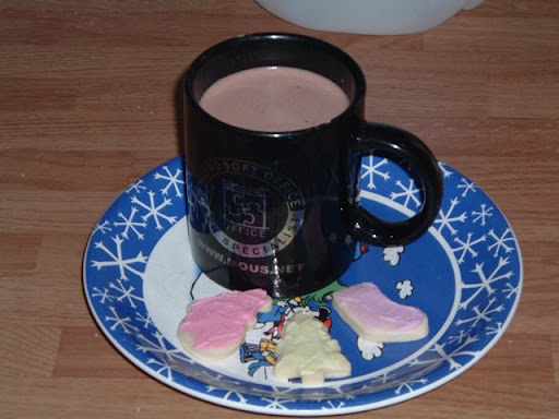 Sugar cookies, in keeper, then with regular sized mug of cocoa (was a snack, not breakfast). Shapes are Santa, tree, and stocking. Colors are from a neon dye pack (thought we'd do something different this year).